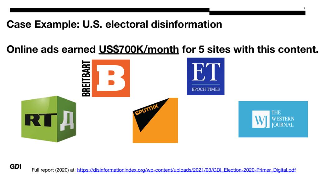In a 2021 European Parliament presentation titled “Monetizing Disinformation in the EU,” Melford identified Russian outlets RT and Sputnik as disinformation sources, alongside U.S. media such as Breitbart, The Epoch Times, and The Western Journal (see visual below). The following year, EU Commission President Ursula von der Leyen banned RT and Sputnik broadcasts and enforced this ban across online platforms.