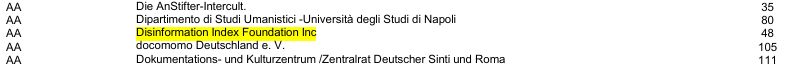 Meanwhile, the German government’s response to a parliamentary inquiry (page 82) reveals that in 2023, precisely as British support was winding down, the German Foreign Office began funding GDI through its U.S. branch. “AA” stands for the Auswärtiges Amt, and “Disinformation Index Foundation” refers to the American arm of GDI. That year, the AA contributed a modest €48,000.