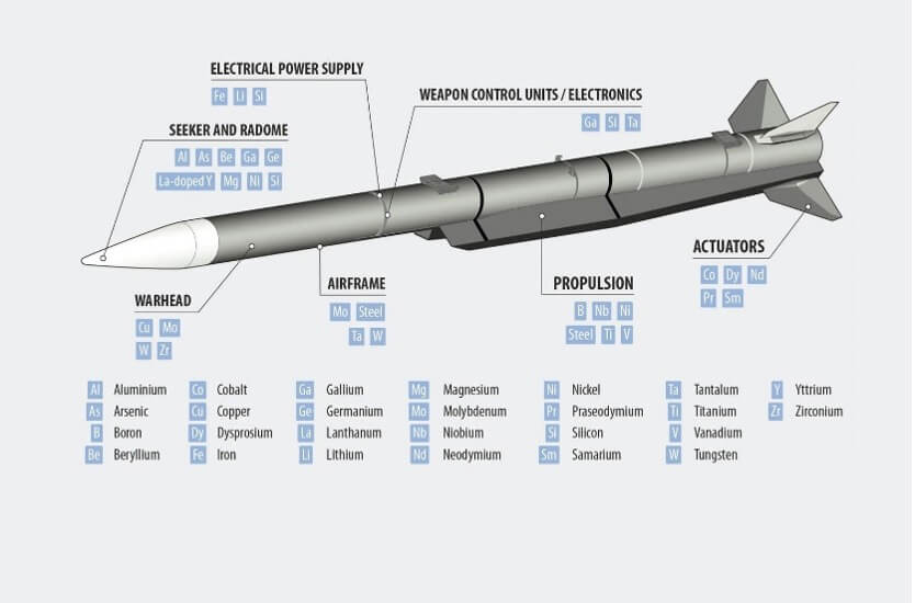The illustration above depicts various elements and substances found inside a “notional” guided missile—not one specific type, but representative of such ordnance. It shows 27 distinct materials, and this is not exhaustive. Missing any single one in production could cause severe manufacturing bottlenecks.